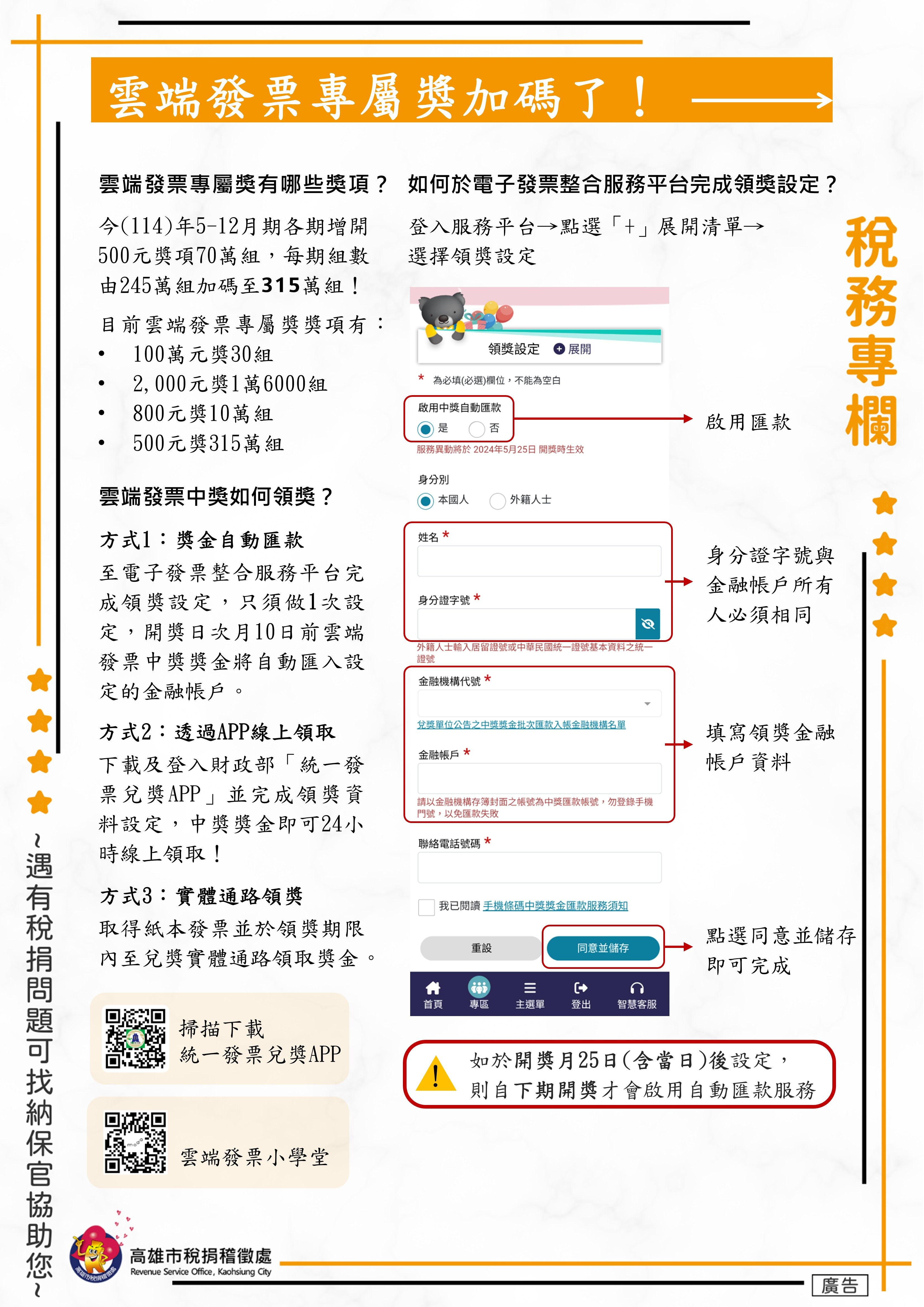 高雄市稅捐稽徵處稅務專欄「雲端發票專屬獎加碼了!」