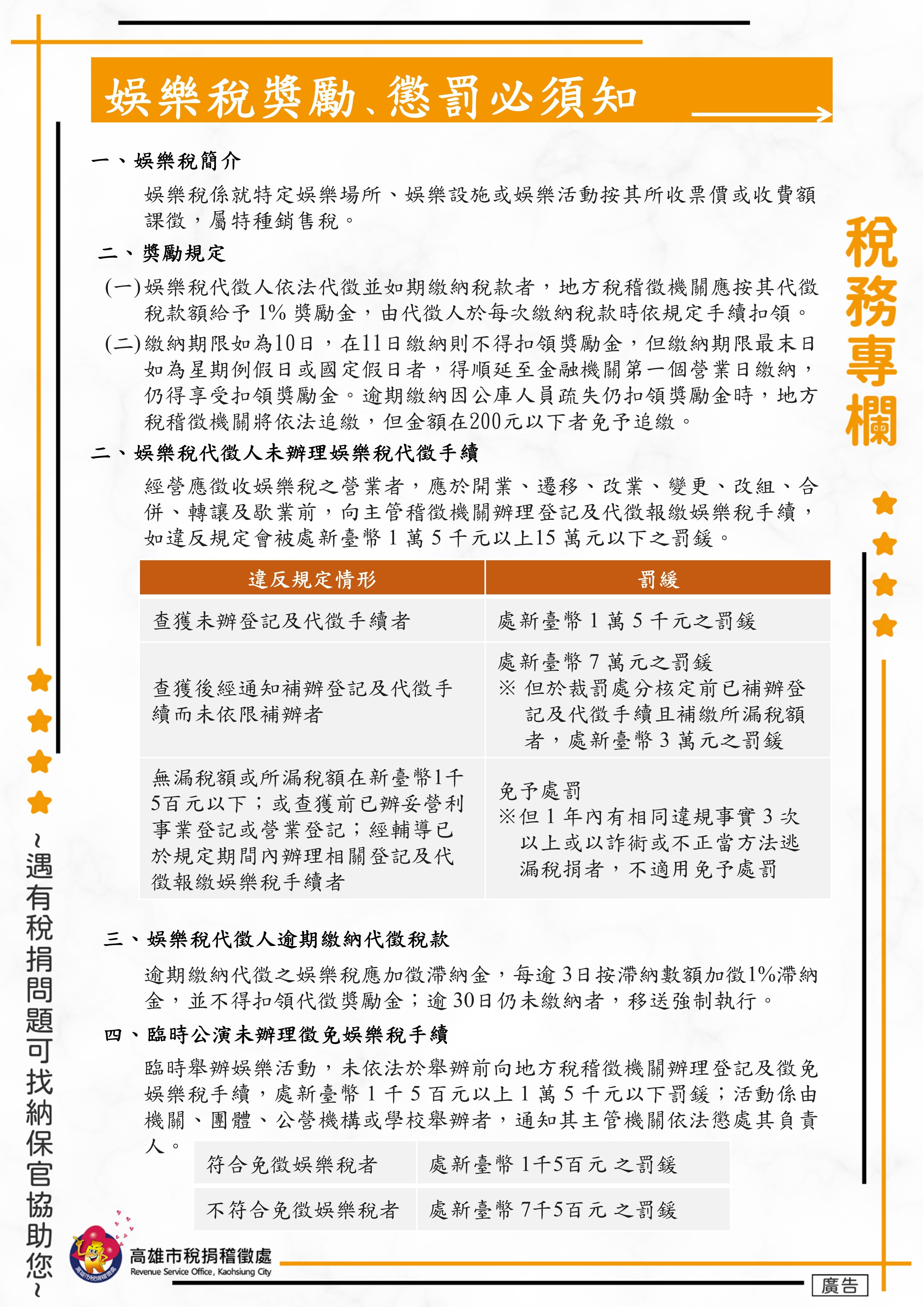 高雄市稅捐稽徵處宣導娛樂稅獎懲規定,檢送本處稅務專欄「娛樂稅獎勵、懲罰必須知」
